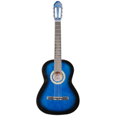 Discover warm, rich tones with the 39” Acoustic Guitar in blue. Its solid linden wood body and plywood back and sides ensure durability and clear sound projection. The nato wood neck and smooth black-finished linden fingerboard with brass frets provide comfortable playability. Chrome-plated tuners keep your instrument in tune, while 6 nylon strings offer a soft, mellow voice perfect for beginners and classical players. Finished with a stylish black-trimmed body, this guitar combines quality and elegance to support your musical journey.