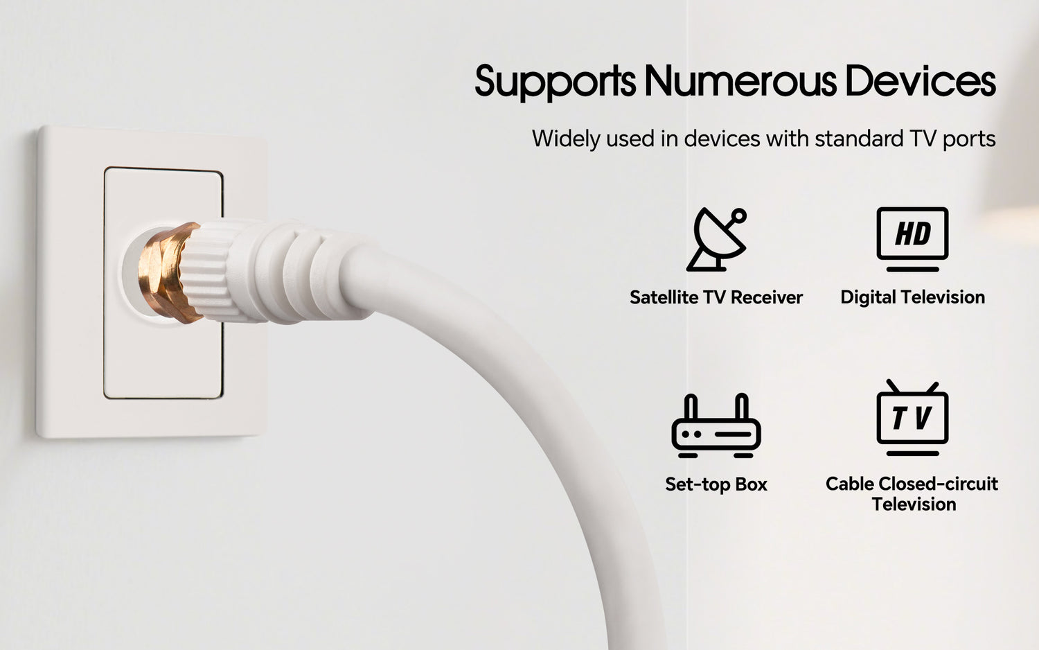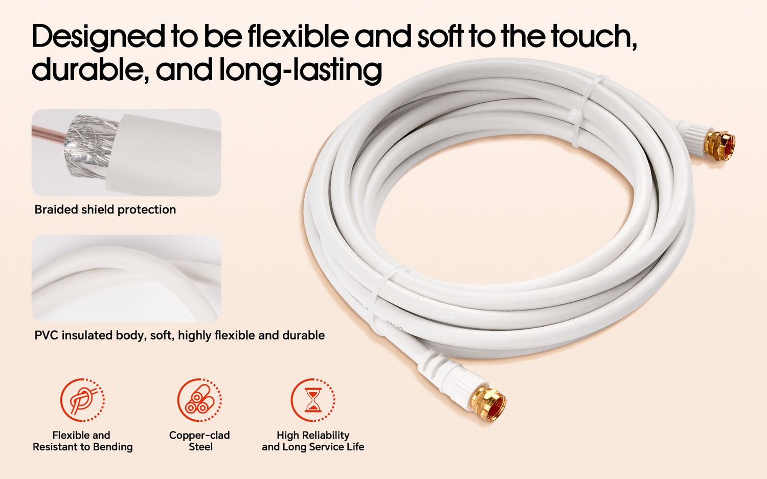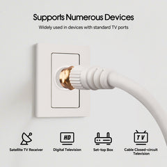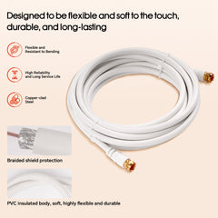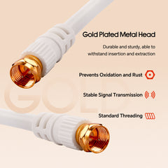 - VERSATILE COMPATIBILITY: This cable with "F" to "F" screw type connectors is ideal for indoor and outdoor use. It can seamlessly connect your TVs, antennas, cable modems, or satellites, providing high-quality and reliable signal transmission. Its compatibility with a range of devices makes it a practical choice for your connectivity needs