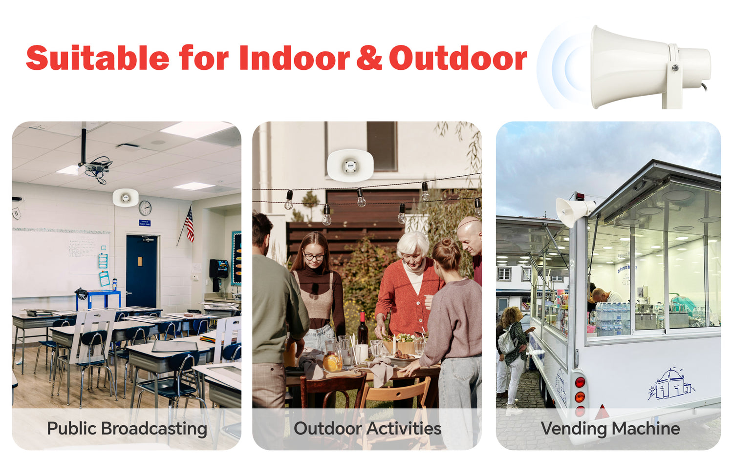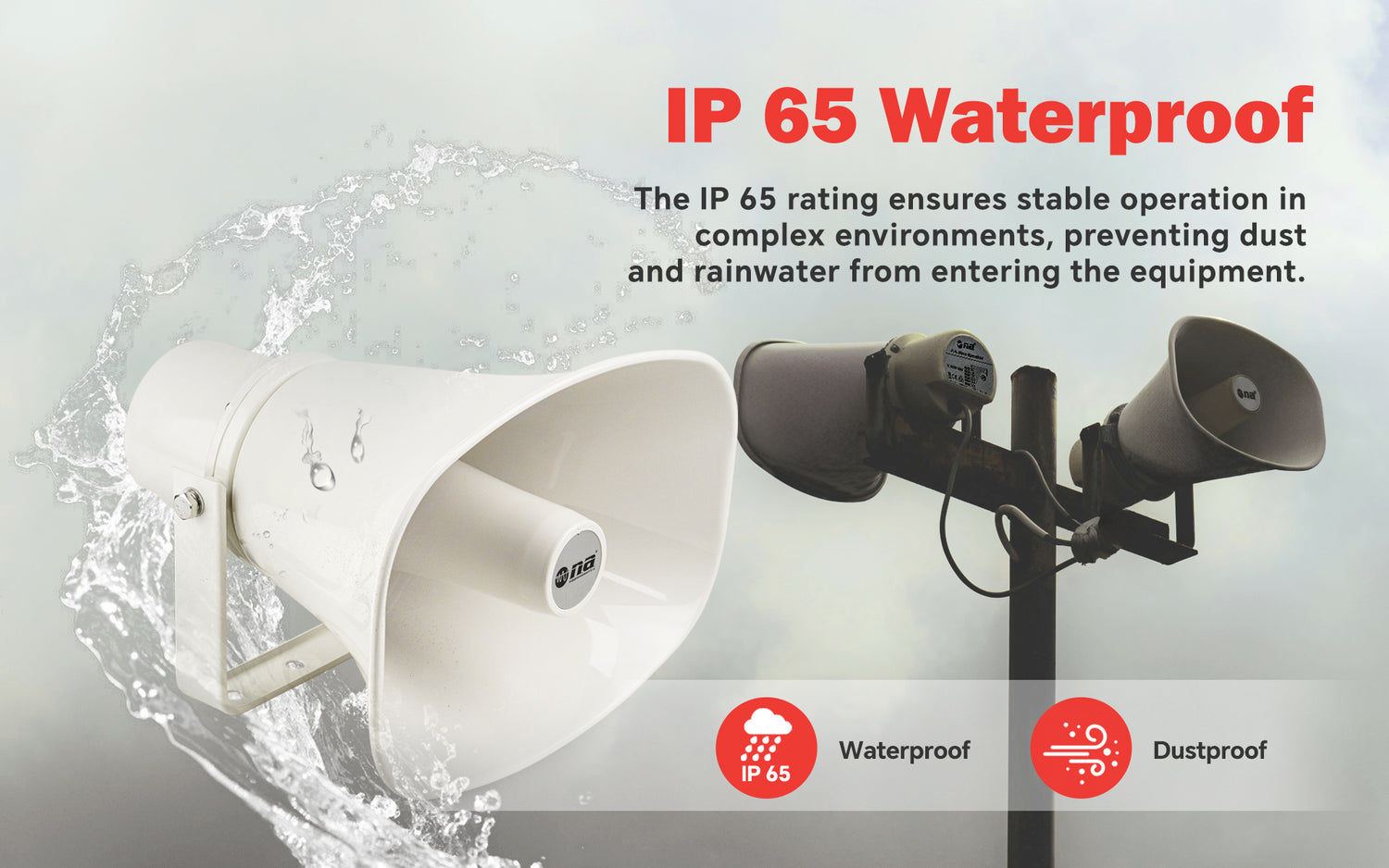- BUILT FOR THE OUTDOORS: With IP65-rated weatherproofing, this speaker is dustproof and water-resistant, providing reliable performance in even the harshest outdoor conditions, from stadiums and event venues to factories and industrial environments. No matter the weather, your audio stays crystal clear