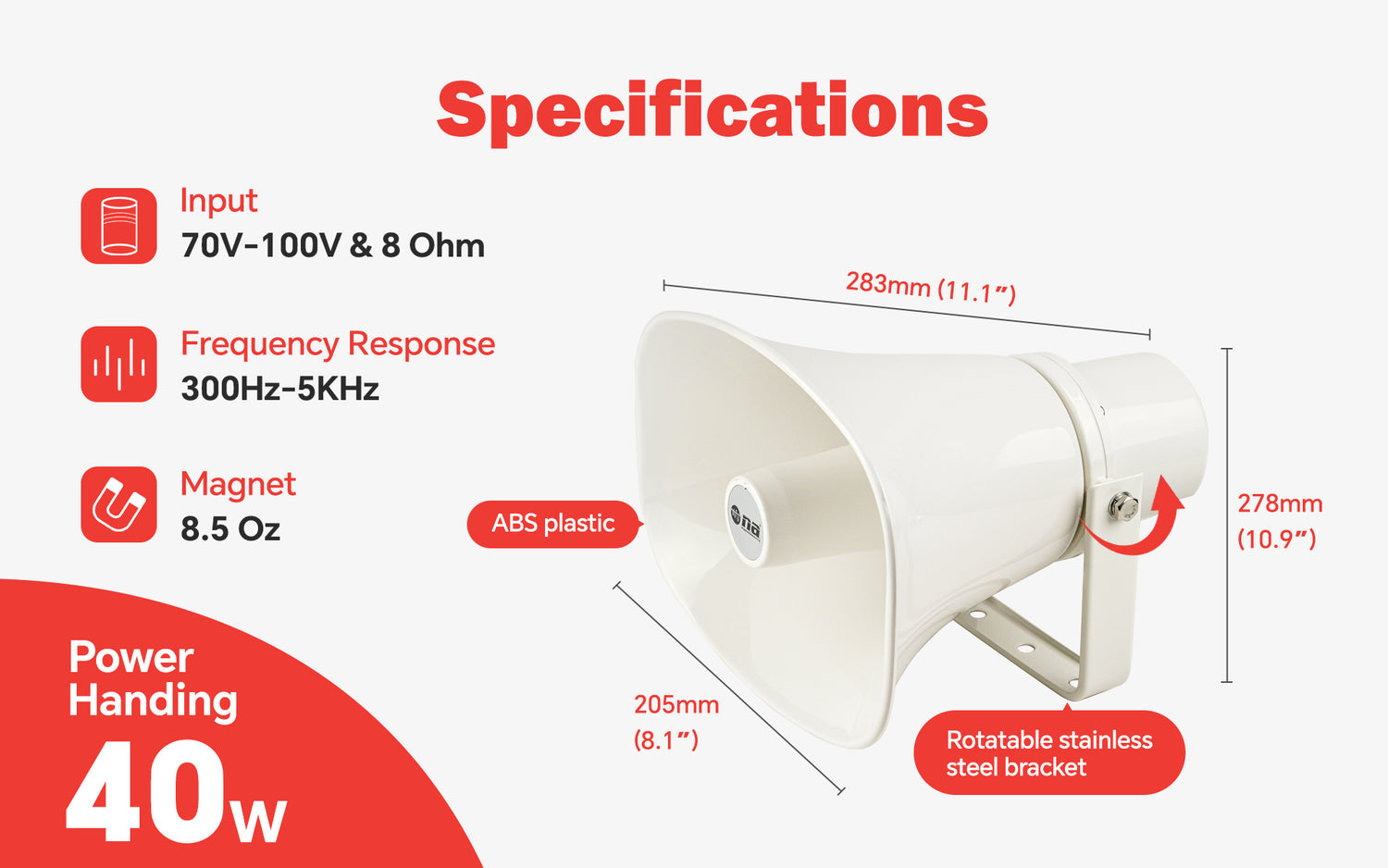- UNMATCHED SOUND POWER: Experience 40W of robust sound, delivering an impressive 110dB SPL, cutting through background noise and ensuring your message is heard clearly, whether indoors or in noisy outdoor environments. Perfect for large crowds, outdoor events, and noisy industrial areas